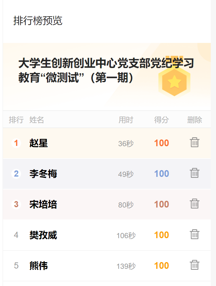 近日,为进一步引导党员干部自觉主动学习党纪知识,推动《中国共产党纪律处分条例》入脑入心,做到学纪、知纪、明纪、守纪,结合党支部党纪学习教育工作安排,大学生创新创业中心党支部开展党纪学习教育微测试(第一期)线上考学活动,全体党员干部踊跃参与答题。