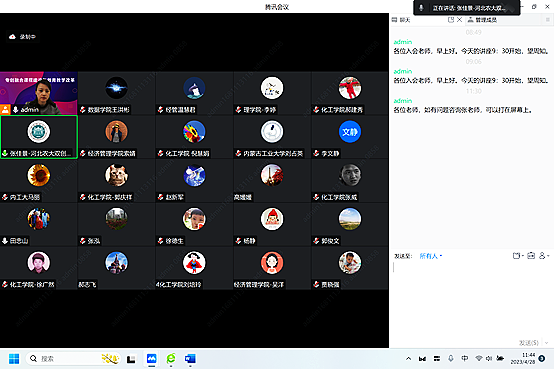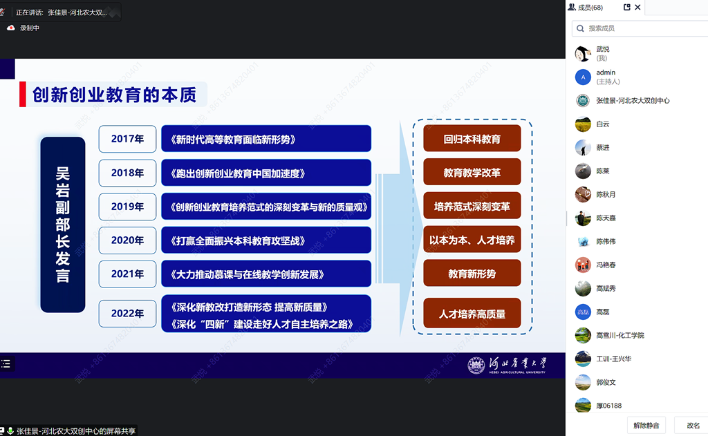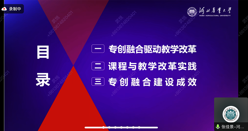 本次培训邀请河北农业大学创新创业教育指导中心副主任、副研究员张佳景作专题辅导讲座。张佳景老师以“专创融合课程建设与教育教学改革”为题,从“专创融合驱动教学改革、课程与教学改革实践 、专创融合建设成效”等三个方面,重点围绕河北农业大学创新创业教育开展情况,从”下沉、陪伴、裂变“分层次递进的角度,介绍了如何布局专业课改革、开设专创融合课程试点、专创元素挖掘和提炼、专创融合原则和方法、底层逻辑、课程建设、推广、技能专训和微专业、卓越班建设等情况,进行了详实的讲解。