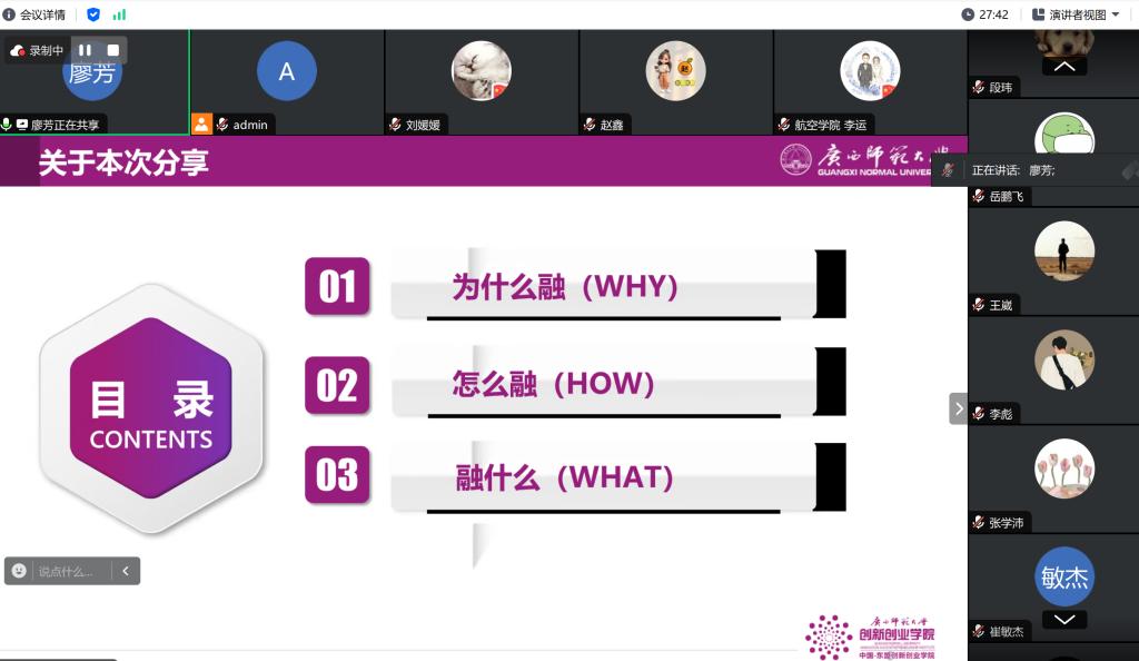 7月10日,大学生创新创业中心组织开展我校专创融合课程建设专题培训,邀请教育部优秀创新创业导师、广西师范大学yl7703永利集团教学科研部长廖芳主讲。大学生创新创业中心工作人员、首批专创融合课程建设负责人和第二批专创融合课程建设申报人等60余人线上参训。