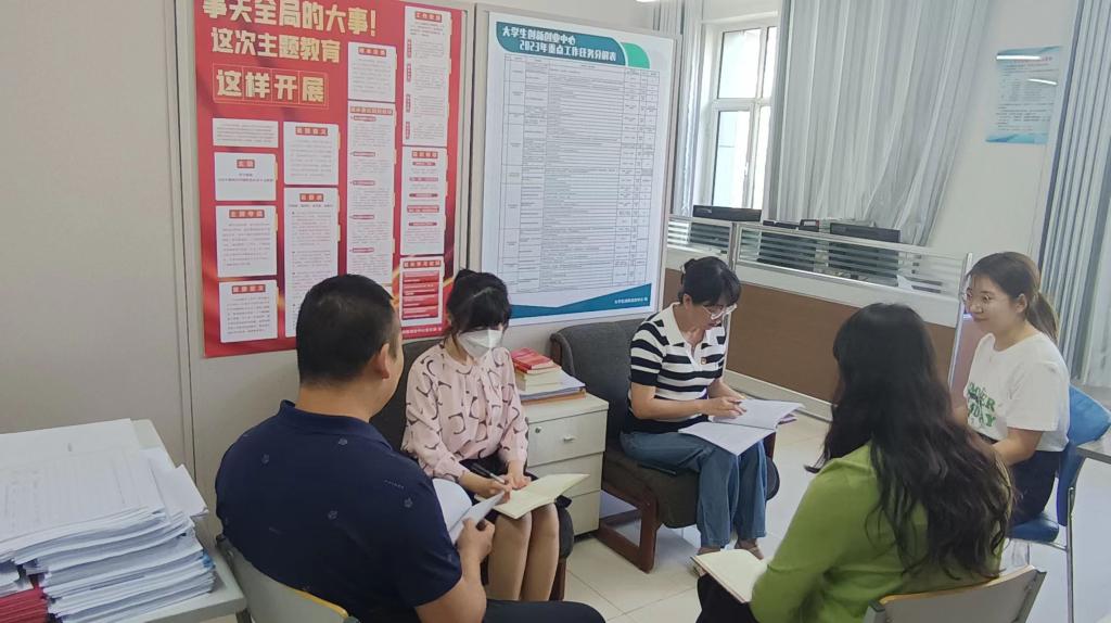 6月5日上午,大学生创新创业中心党支部在明德楼328召开学习贯彻习近平新时代中国特色社会主义思想主题教育读书班第五次学习。党支部书记李冬梅主持,全体党员参加。