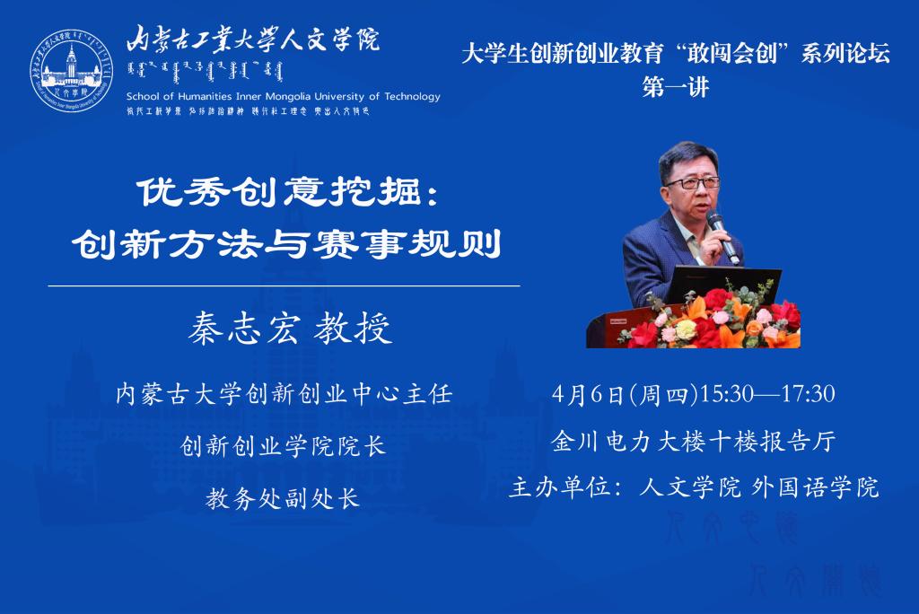 2023年4月6日下午15:30,内蒙古大学经济管理学院教授、硕士研究生导师,创新创业中心主任、yl7703永利集团院长(兼)、教务处副处长(兼)秦志宏教授带来了题为“优秀创意挖掘:创新方法与赛事规则”首场报告。秦教授围绕互联网+赛事的赛事规则,种子项目的培育方法等进行了详细的介绍。