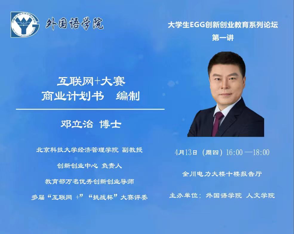 2023年4月13日下午16:00,北京科技大学经济管理学院副教授、管理学博士,创新创业研究中心负责人邓立治教授带来了题为“互联网+大赛商业计划书编制”的精彩报告。报告从商业计划书的定义和功能入手,重点讲授商业计划书制作系统结构:四层次结构与十模块内容。