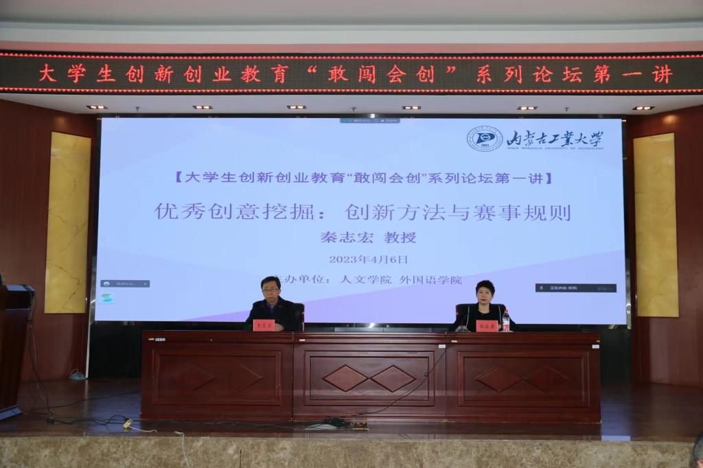 4月6日下午,我院与外国语学院联合举办了大学生创新创业教育“敢闯会创”系列论坛第一讲。本次论坛邀请了内蒙古大学创新创业中心主任、yl7703永利集团院长秦志宏教授主讲。论坛由我院副院长张莉蔚主持,外国语学院党委书记冯小虎、副院长张媛、创新创业教育骨干教师及本科生、研究生200余人参加了本次活动。